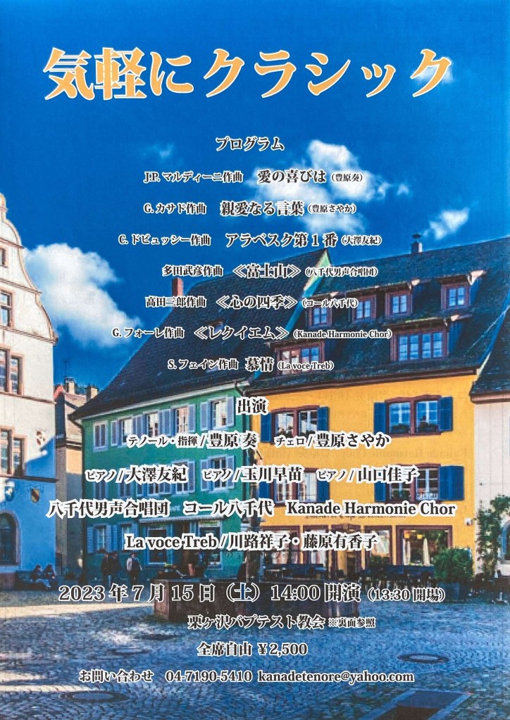 2023年7月15日(土)に栗ヶ沢バプテスト教会にて開催されます「気軽にクラシック」に出演します。