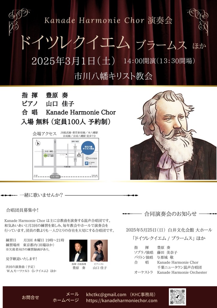 来年5月に行われる千葉ニュータウン混成合唱団との合同演奏会に先駆け、KHCの単独ブラームス《ドイツレクイエム》公演を行うこととなりました!